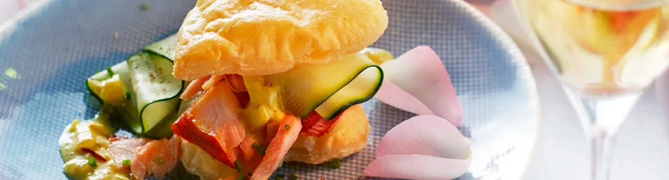 Leg een bladerdeeghart op elk (voorverwarmd) bord en verdeel stukjes zalm erover. Drapeer hierop losjes een paar plakken courgette. Leg de andere bladerdeegharten erop en giet een straaltje saffraansaus rondom de tompouces.