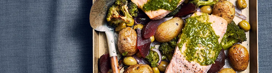 Rooster de groenten 10 min. Leg de zalmfilets tussen de groenten, Besprenkel de vis met 2 el olijfolie en rooster samen in nog 15-20 min. gaar.