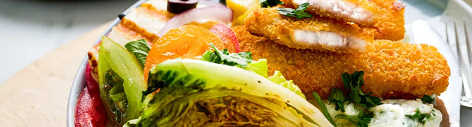 6. Haal de Vissticks uit de oven. Presenteer je Vissticks met de puree en de gegrilde litte gems.