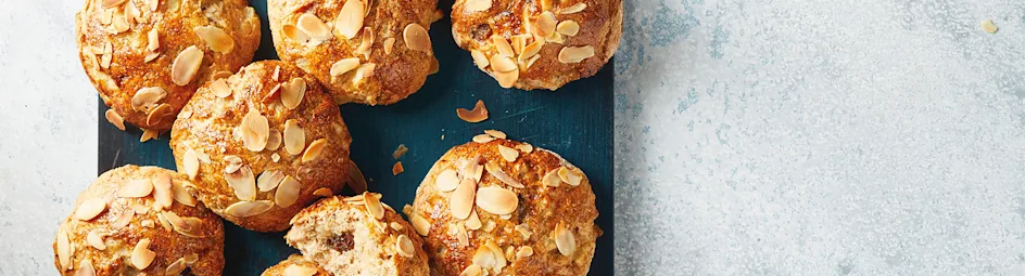 Vorm van het deeg 12 balletjes; gebruik wanneer het deeg plakt wat extra meel. Zorg dat de rozijnen in de broodjes zitten. Leg ze op de bakplaat en laat nogmaals afgedekt 45 min. rijzen.