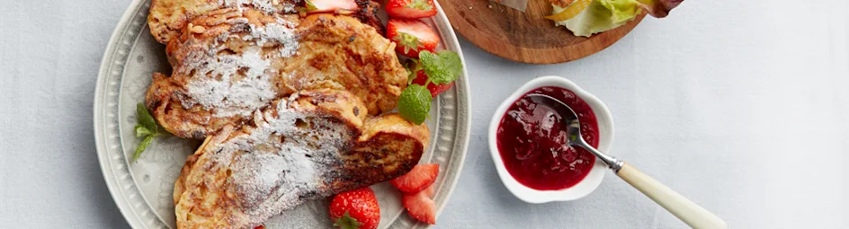 Verwijder de kroontjes van de aardbeien. Serveer de warme wentelteefjes op een mooie schaal. Garneer met het rode fruit en poedersuiker.