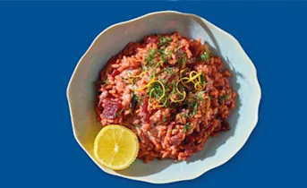 - Rode biet grillen: verwarm de oven op 180°. Snijd de rode biet in stukken, leg de stukken in een ovenschaal en besprenkel met olie. Gril de rode biet gedurende 45 minuten gaar.